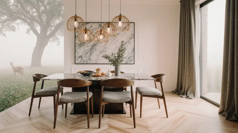 Decor accents play a key role in completing the look. Statement lighting above the table anchors the space, while mirrors on adjacent walls amplify light and create the illusion of depth. Art, vases, and carefully curated decorative objects add personality without cluttering the space. Layering small decorative touches enhances warmth and style.